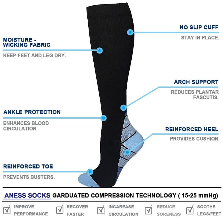 Genom att erbjuda kompression stöder strumporna också din blodcirkulation. Detta kan vara till nytta för dem som upplever benmärg, åderbråck eller svullnad.