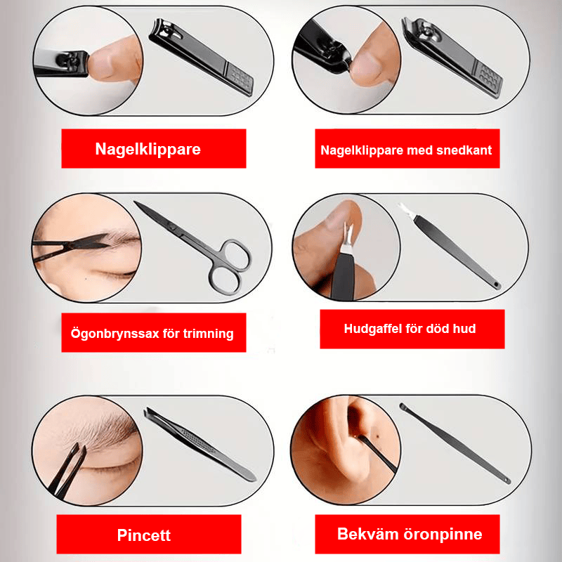 Från vårt svenska lager till din dörr på 1-2 dagar – inga långväga leveranser!Manikyrkit för män och kvinnor - Svart portabelt set med 7 delar för användning både på resan och hemma.