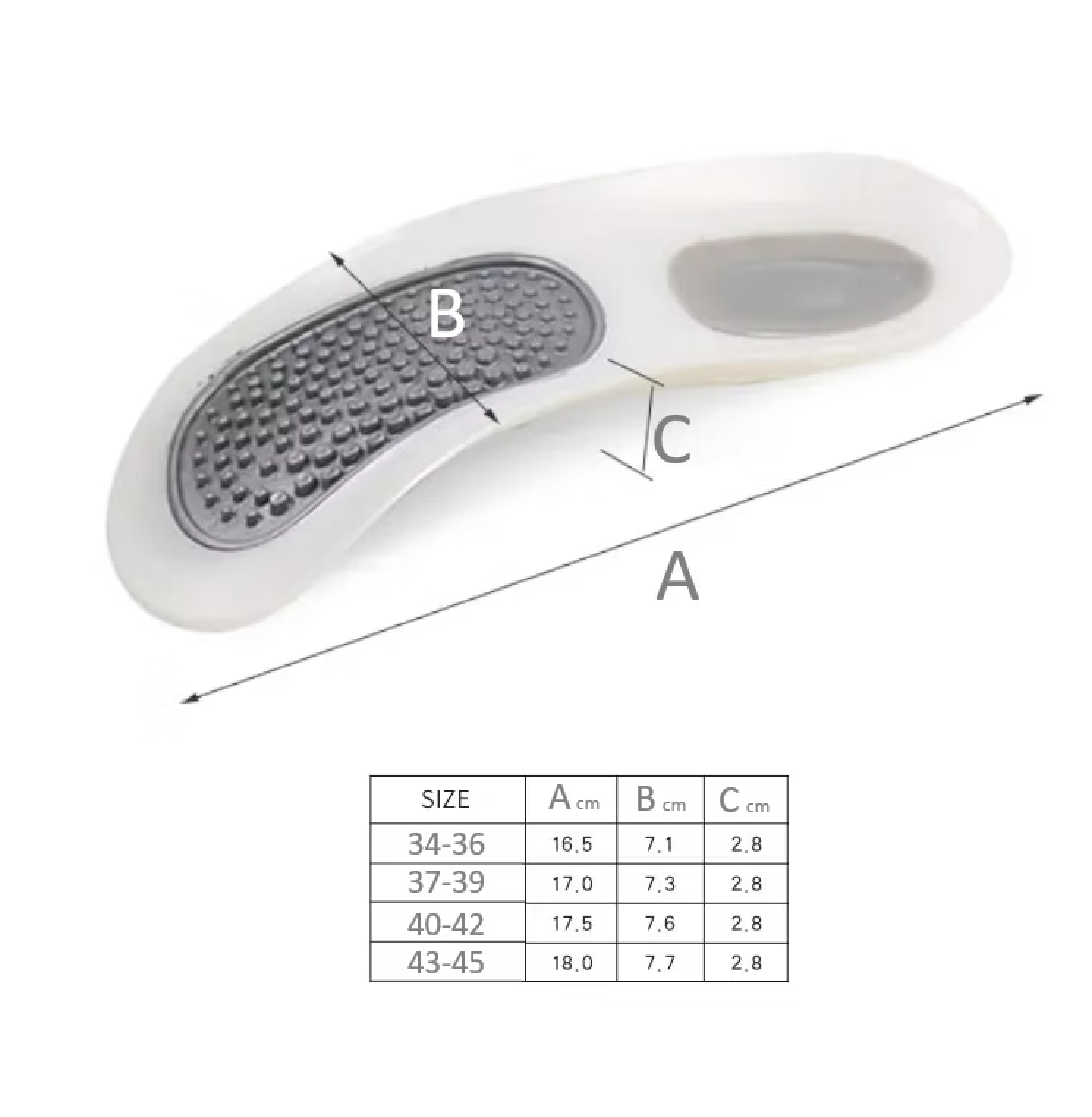 De buede, fleksible innleggssålene gir komfortabel avlastning for fotbuen og forbedrer fotens støtte ved hvert steg. Ved å bruke disse innleggene kan du redusere ubehag og forhindre fotsmerter som ofte fører til kne-, hofte- og ryggsmerter.