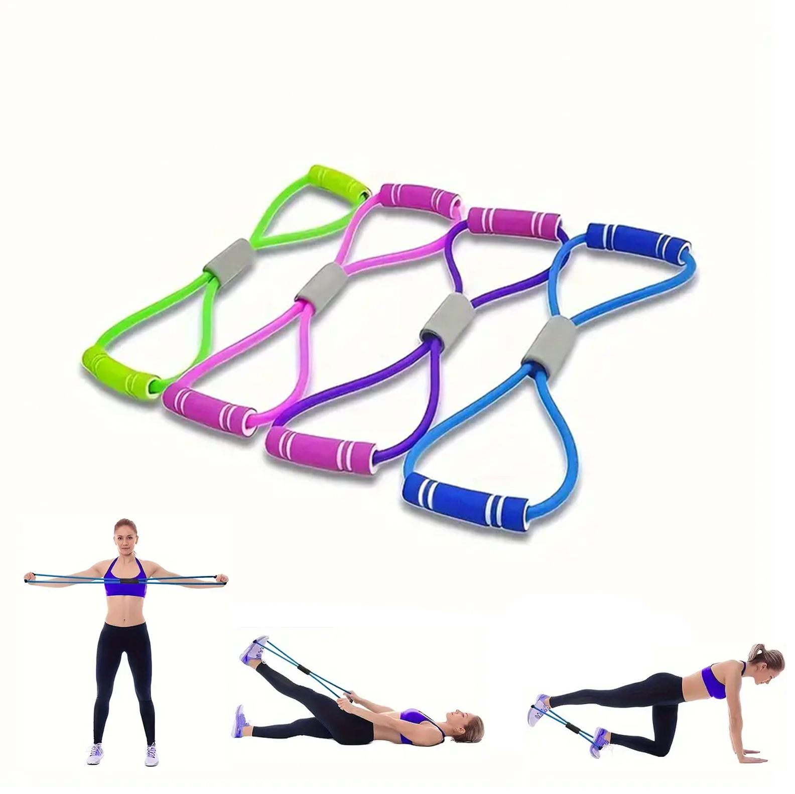 Ett 8-format träningsband är ett elastiskt motståndsband med handtag som används för styrketräning, stretching, yoga och rehabilitering. Formen gör det enkelt att träna både överkropp och underkropp.